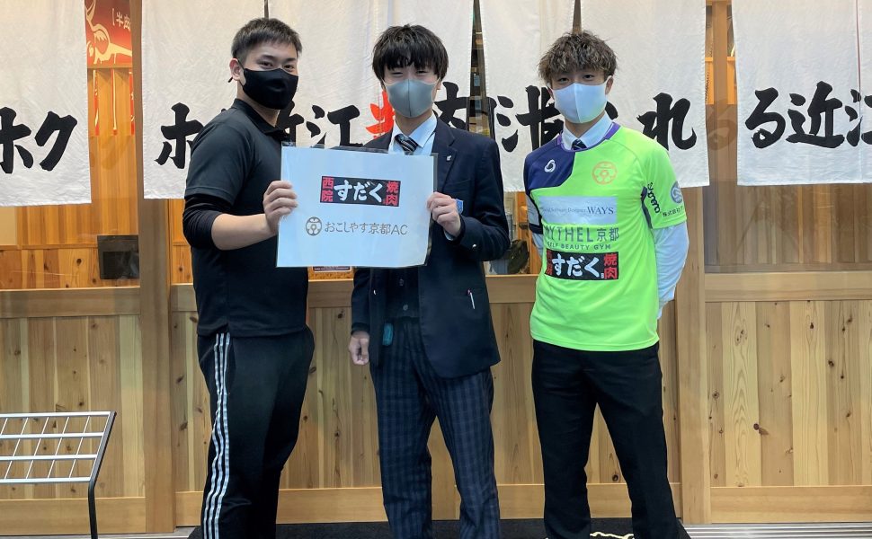近江焼肉ホルモンすだく京都西院店様と共に闘うことを誇りに想い、最大目標であるJFL昇格を勝ち取ることができますよう取り組んで参ります。