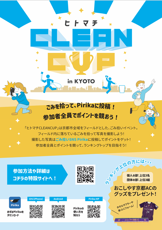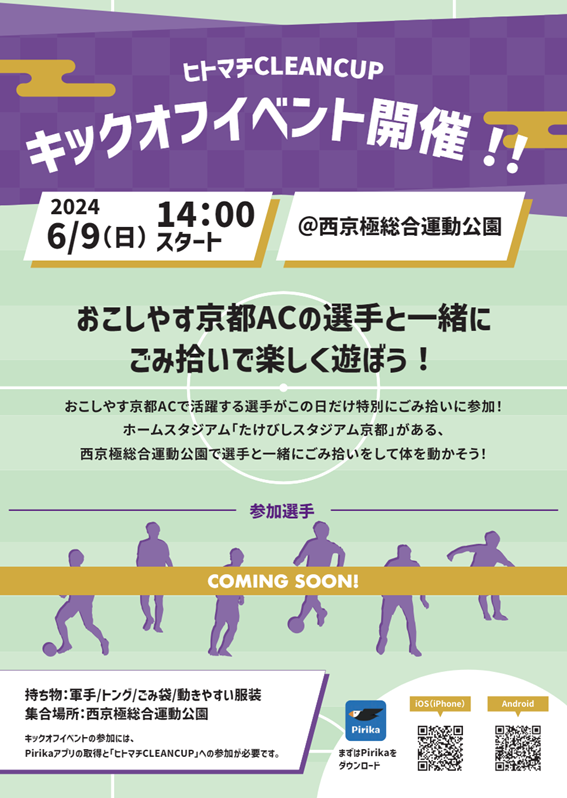 おこしやす京都ACでは、パートナー企業様のジャパン総研様が開催されている「ヒトマチCLEAN CUP」のキックオフイベントとして、6/9(日)のリーグ第5節終了後に、選手と一緒にゴミ拾いをしながら体を動かすイベントを実施いたします。