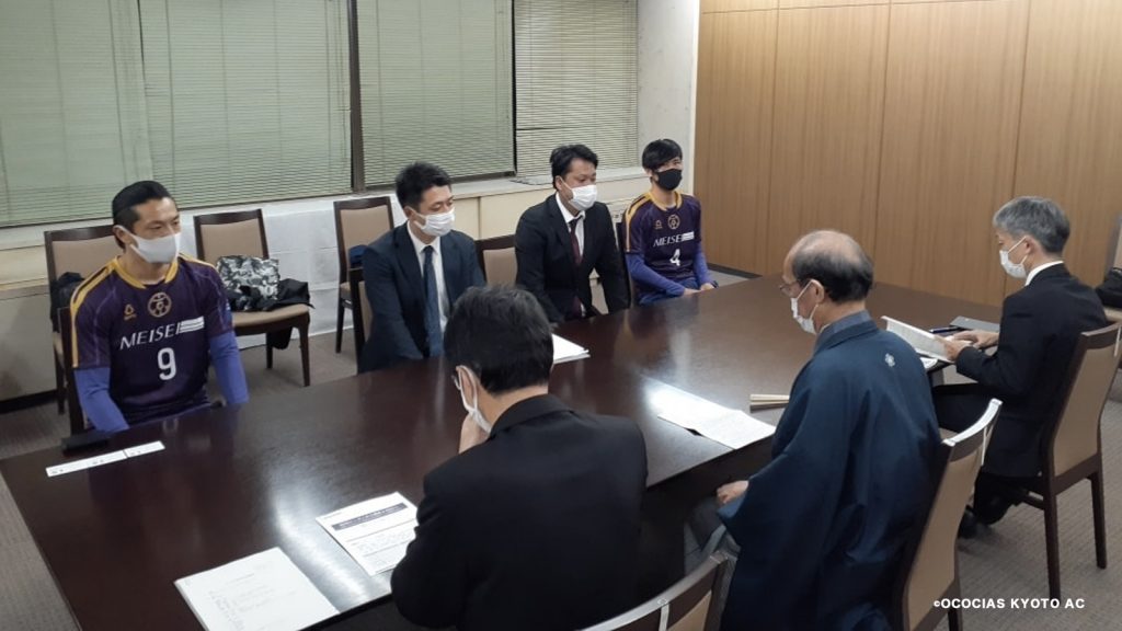 この度、12月2日(水)に添田隆司代表、瀧原直彬監督、原一樹選手、榎本滉大選手が門川大作市長への表敬訪問をいたしましたのでご報告いたします。