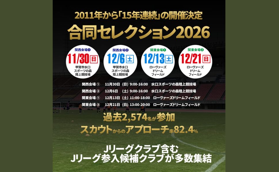 セレクションの様子はビデオ撮影させて頂き、合同セレクション2026のYoutubeチャンネルで公開させて頂きます。会場にお越しのチームだけでなく、他会場に来られるチームにも、セレクション後にお電話またはメールで連絡が来る可能性がございますので、ご了承ください。