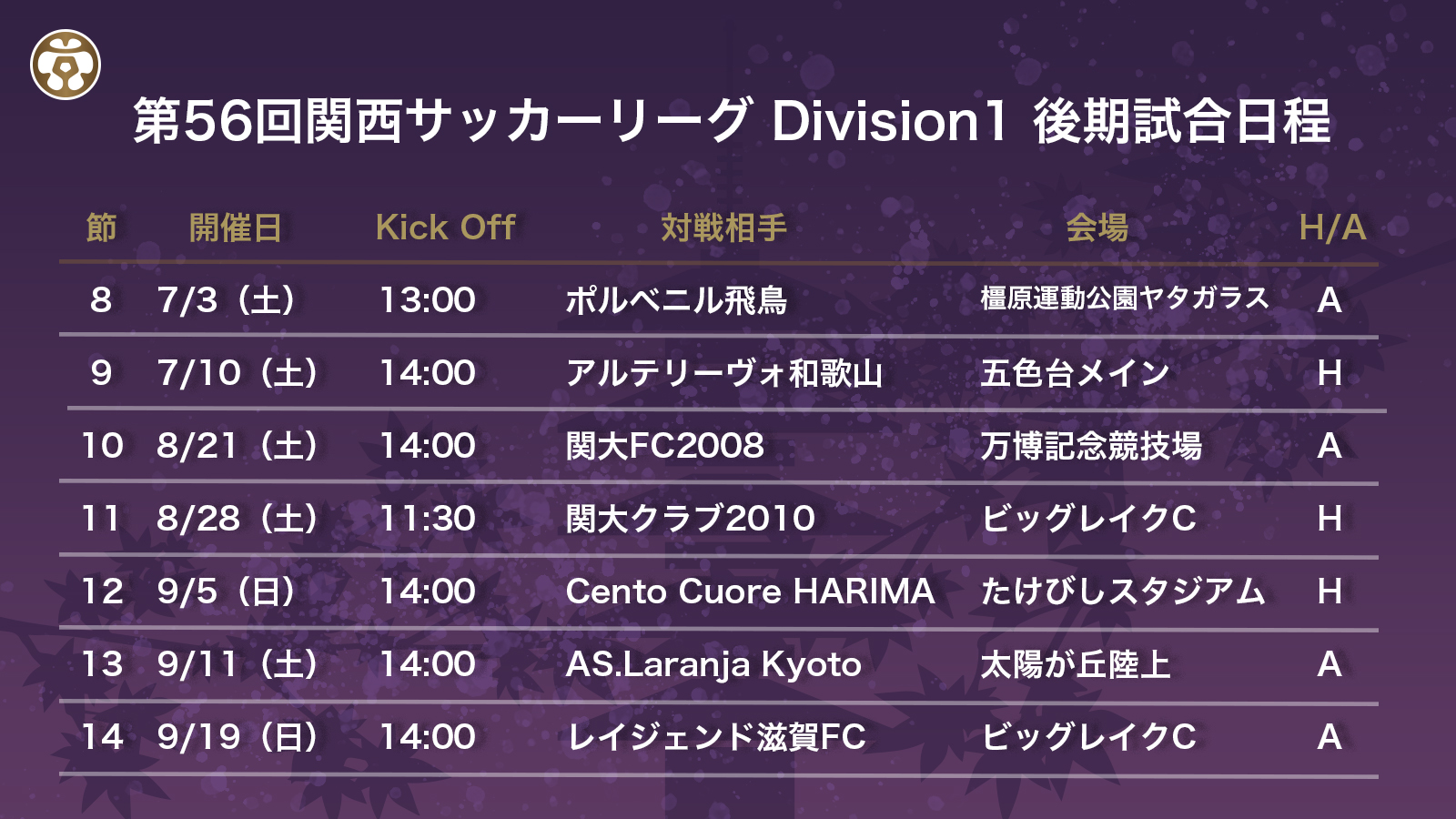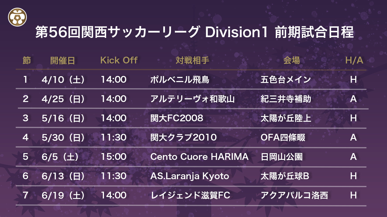 このたび、第56回関西サッカーリーグ Division1の試合日程が決定しましたのでお知らせします。